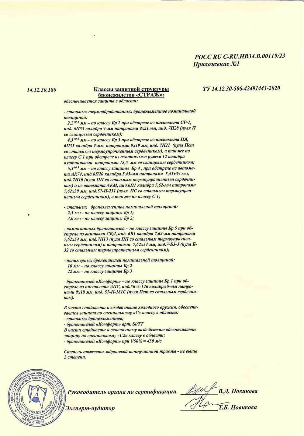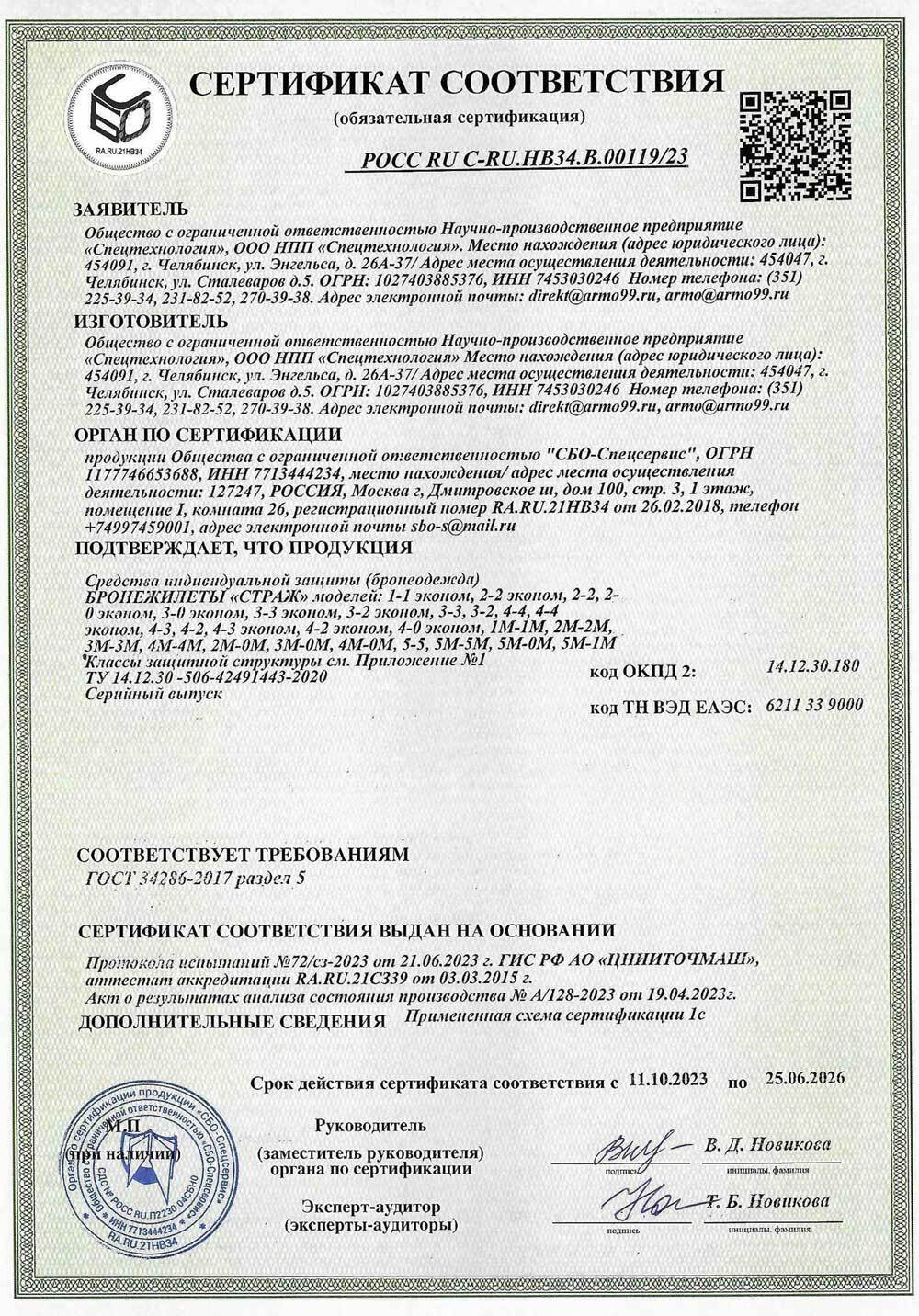 Бронежилет в грудной, спинной и боковых проекциях обеспечивает надежную защиту по БР4 классу защиты по ГОСТ 34286-2017 (пуль калибров 5.45×39 АК-74 и 7.62×39 АКМ). Дополнительно защищая по С1 классу (от пуль охотничьего оружия 12 к.).