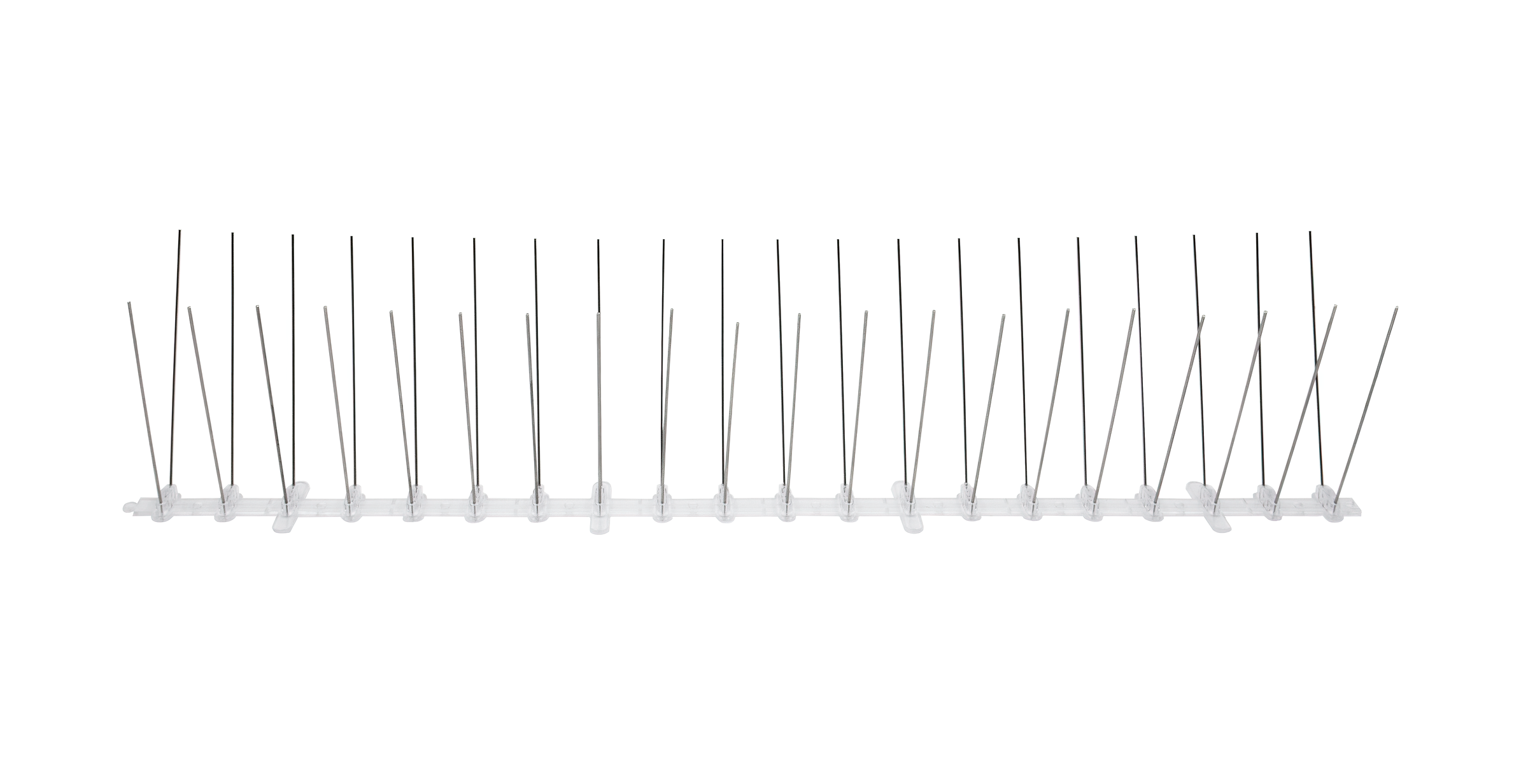 Эти шипы эффективно предотвращают сидение средних по размеру птиц, таких как голуби, дрозды, скворцы, вороны, галки, чайки и другие подобные виды. Каждая секция имеет форму пластины с иглами, расходящимися в стороны, образуя букву "V". Они могут быть установлены на криволинейные поверхности с радиусом до 7,5 см. Монтаж осуществляется с использованием жидких гвоздей для наружных работ с поликарбонатом, а также с помощью болтов или саморезов. При необходимости мы предоставляем услуги по установке, включая работы в труднодоступных местах.